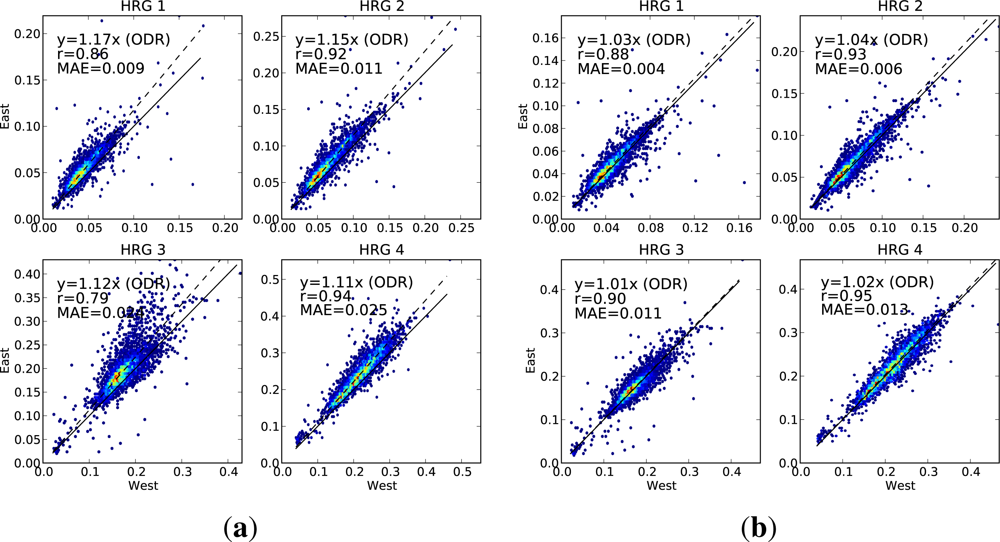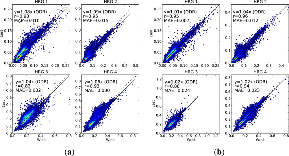 SPOT, case 6. Validation pixels from overlaps viewed from off nadir in opposite directions. (a) Reflectance from west view against uncorrected reflectance from east view; (b) Reflectance from east view has been corrected to angles for west view.