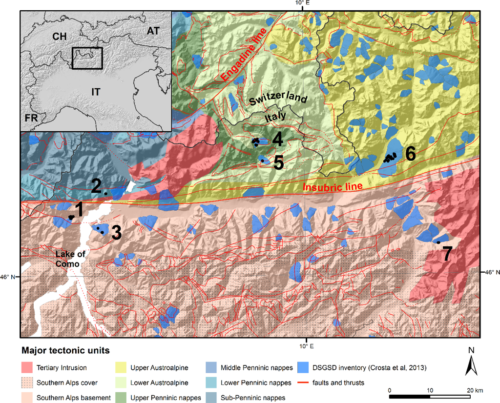 Seven slow-moving large slope instabilities have been analyzed in this paper (Figure 1). The Catasco rockslide (#1 in Figure 1), Mt. Legnoncino DSGSD (#3 in Figure 1) and Saviore DSGSD (#7 in Figure 1) occur in the basement of the Southern Alpine nappe. The lithology of these different sites is quite similar, mainly consisting of paragneiss and schist. The Montalto rockslide (#2 in Figure 1) belongs to the lower Penninic nappe, and its lithology is characterized by paragneiss. The Lake Palù DSGSD (#4 in Figure 1) and Caspoggio DSGSD (#5 in Figure 1) lie at the contact between the Upper Penninic nappe and the Austroalpine basement. Here, the Penninic units are composed of oceanic ophiolites and serpentines and the Austroalpine units of gneiss and schists. The Mt. Padrio-Varadega DSGSD (#6 in Figure 1) belongs to the Austroalpine basement, and the lithology consists of gneiss (Punta della Pietra Rossa Formation).