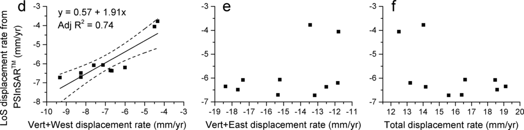 Comparison between PSInSAR™ LOS displacement rate (ascending) and displacement rates monitored by ground-based optical targets. Different components of optical target displacements vectors are used: (a) vertical component, (b) north component, (c) west component, (d) composed vertical and west component, (e) composed vertical and north component and (f) total vector. The best-fitting line in panel (d) was obtained by least square regression.