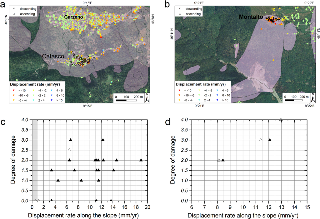 Displacement rate and damage to buildings for the Catasco and Montalto rockslides. (a) PSInSAR™ displacement rate map and location of the surveyed buildings for the Catasco rockslide (black polygons); (b) PSInSAR™ displacement rate map and location of the surveyed buildings for the Montalto rockslide (black polygons); (c) damage degree of buildings of the Catasco rockslide as a function of the displacement rate for the LRA dataset; (d) damage degree of buildings of the Montalto rockslide as a function of the displacement rate for the LRA dataset. Solid and open triangles in panels (c,d) refer to buildings with and without wall coating, respectively. The grey area in panel (c) represents the average standard deviation (Table 2).