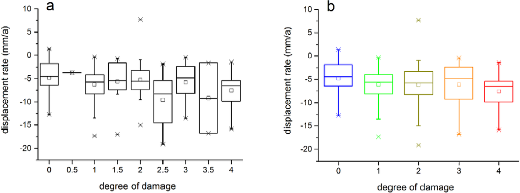 The PSInSAR™ data seems also suitable for the analysis of displacement rates associated with the damage of structures and infrastructures. Although this correlation is not always clear for the studied sites, the general trend of the data observed in box and whiskers plots (Figure 14) shows that the degree of damage is significantly correlated with the displacement rate. For instance, considering the 25th-percentile of the displacement rate (Figure 14b), we observe that this varies linearly between −5 and −10 mm/yr from a damage level of 0 to a damage level of 4. The distributions of the displacement rate values for each degree of damage (Figure 14) are very dispersed, due to a large uncertainty. This uncertainty mainly derives from the complexity of the slope instability behavior, sometimes from the difficulty of associating a unique damage value to a structure, and, finally, the different position of the structure within the landslide.