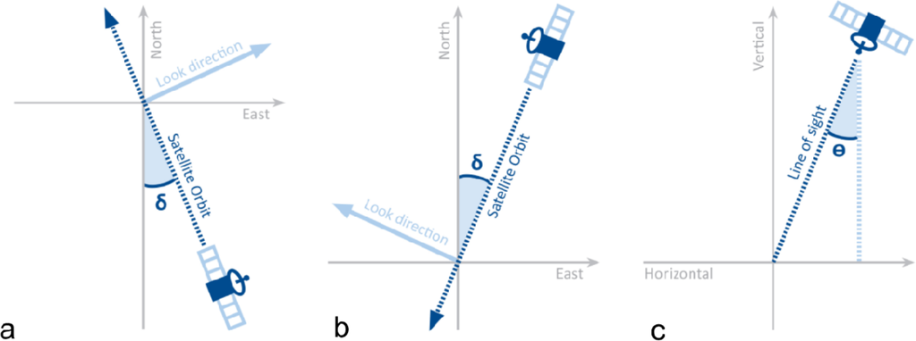 Satellite acquisition geometry: look direction and angle between the azimuth and north direction, δ, for (a) ascending and (b) descending modes; (c) local incidence angle, θ.