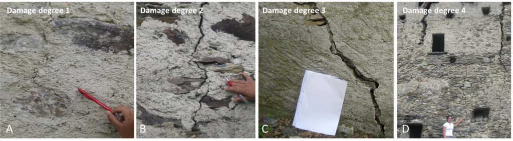The Mt. Legnoncino DSGSD also shows a good correlation between the degree of damage and the displacement rate, although some buildings show an anomalous degree of damage. In particular, a few buildings have a small degree of damage notwithstanding a large displacement rate. These buildings present recent wall coatings, possibly covering minor damages to the structure. This problem has been observed also at other sites, where walls of many buildings appeared to have been recently repaired and rendered. In those cases, the estimated degree of damage can be strongly underestimated. It must be stressed that some buildings have been built using different techniques and materials and at very different times. This can control the level of damage. Furthermore, in the case of slow moving landslides, old structures could have been subjected to a larger cumulated displacement or more acceleration events.