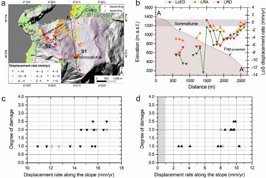 Finally, for the Saviore DSGSD and Catasco rockslide, the poor correlation between the degree of damage and the displacement rate can be attributed to the low capability of the PSInSAR™ technique to detect movements mainly directed toward north or south, thus parallel to the satellite orbit and perpendicular to the LOS.