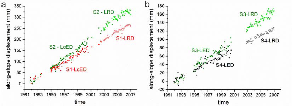 PSInSAR™ displacement time series for (a) Mt. Legnoncino DSGSD, sites S1 and S2 in Figure 5a, and (b) Mt. Padrio-Varadega DSGSD, sites S3 and S4 in 1st figure in Section 4.3. The displacements monitored with ERS 1-2 satellites (LcED, LED datasets) were extrapolated to 2003 and added to the LRD displacements to show a continuous time history of the sites.