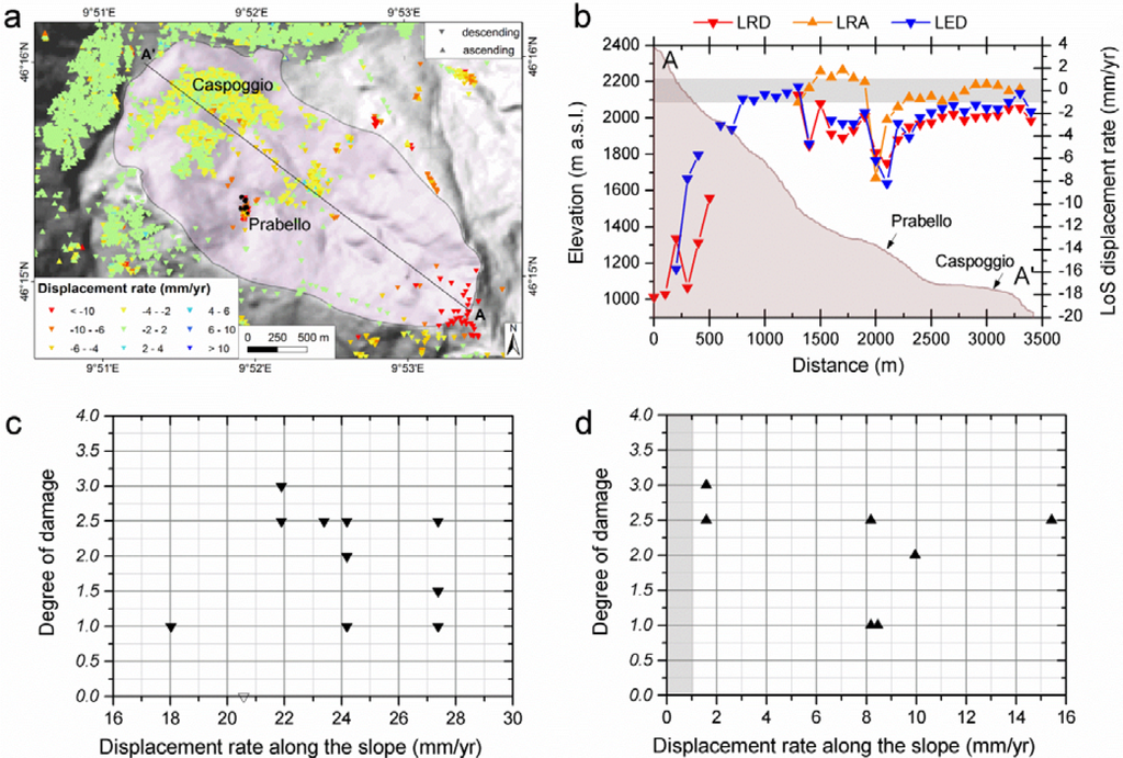 Displacement rate and damage to buildings for the Caspoggio DSGSD. (a) PSInSAR™ displacement rate map and location of the surveyed buildings (black polygons); (b) longitudinal swath profile of the displacement rate for available PS datasets; (c) damage degree of buildings as a function of the displacement rate for the LRD dataset; (d) damage degree of buildings as a function of the displacement rate for the LRA dataset. Solid and open triangles in panels (c,d) refer to buildings with and without wall coating, respectively. The grey area in panels (b,c) represents the average standard deviation (Table 2).