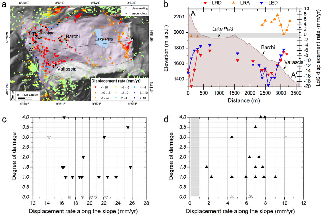 Displacement rate and damage to buildings for the Lake Palù DSGSD. (a) PSInSAR™ displacement rate map and location of the surveyed buildings (black polygons); (b) longitudinal swath profile of the displacement rate for available PSI datasets; (c) damage degree of buildings as a function of the displacement rate for the LRD dataset; (d) damage degree of buildings as a function of the displacement rate for the LRA dataset. Solid and open triangles in panels (c,d) refer to buildings with and without wall coating, respectively. The grey area in panels (b,d) represents the average standard deviation (Table 2).