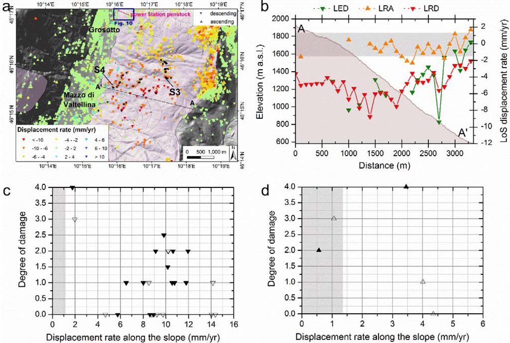 Displacement rate and damage to buildings for the Mt. Legnoncino DSGSD. (a) PSInSAR™ displacement rate map and location of the surveyed buildings (black polygons); (b) longitudinal swath profile of the displacement rate for available PS datasets; (c) damage degree of buildings as a function of the displacement rate for the LRD dataset; (d) damage degree of buildings as a function of the displacement rate for the LRA dataset. Solid and open triangles in panels (c,d) refer to buildings with and without wall coating, respectively. The grey area in panels (b,d) represents the average standard deviation (Table 2). LOS, line of sight.
