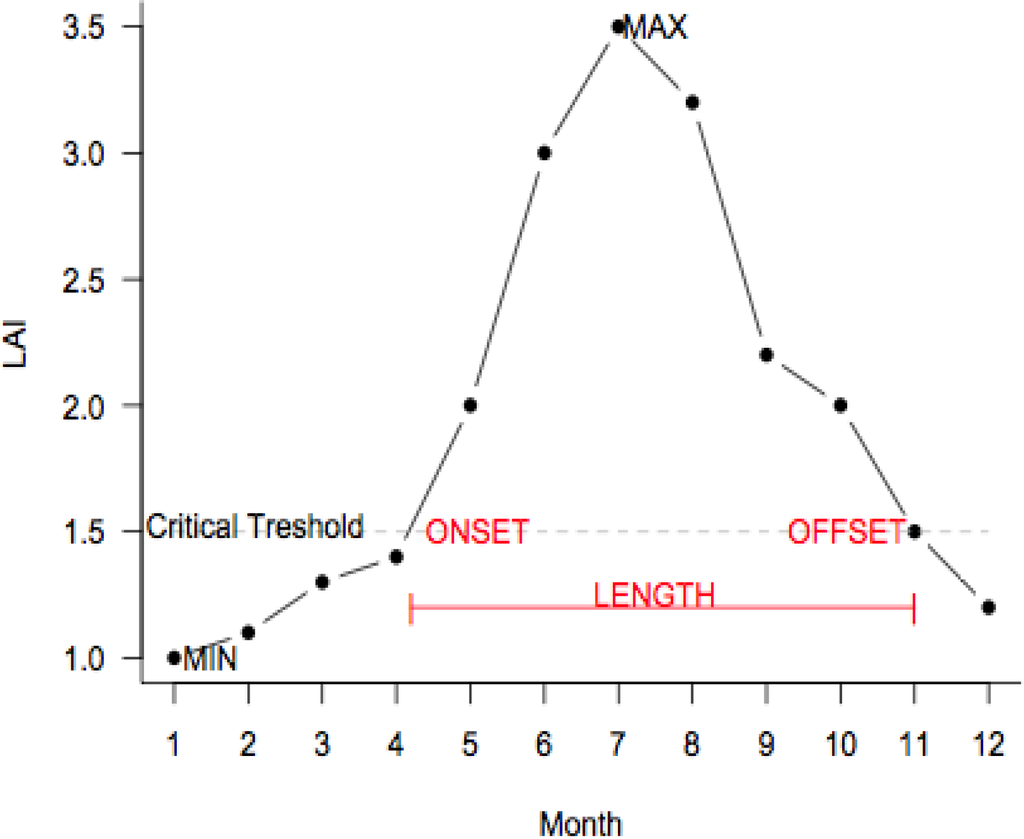 Growing season onset, dormancy and length were calculated based on the seasonal amplitude. LAI has been shown to have a normal distribution over the year in northern latitudes [37], so we consider the start of the growing season to be 20% of the maximum amplitude. This processes has been proven to be more stable for monthly data, compared to an approach based on sudden LAI changes.