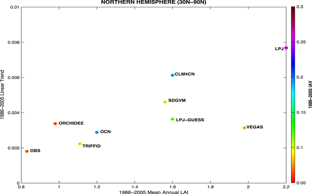 Linear trend against average LAI for each model and satellite observations, with IAV represented as colors. The data represents the whole high-latitude Northern Hemisphere (30°–90°) for the time period 1986–2005.