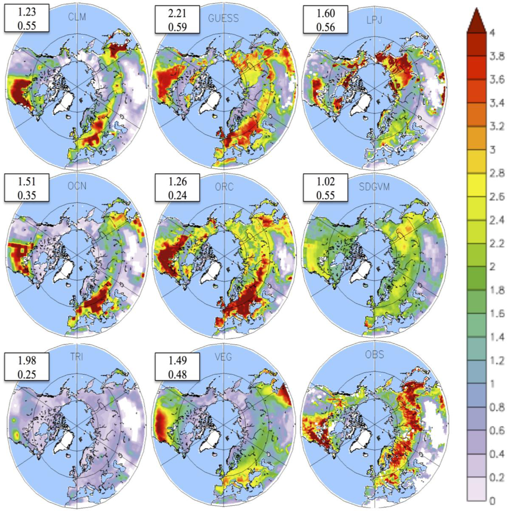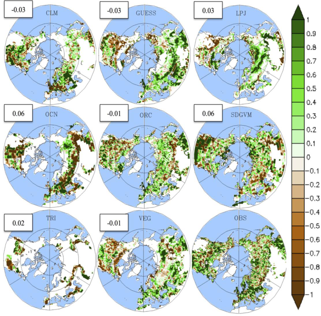 All models show a positive LAI trend in most of the Northern Hemisphere, which is consistent with the satellite observations (Figure 8). Nevertheless, there is little agreement on the spatial distribution of this phenomenon, with spatial correlation values between −0.05 and 0.12. In the satellite observation most of the greening occurs over 55°–90°N in Eurasia, while in models it is homogeneously distributed. More puzzling is the reduction of LAI in LPJ-GUESS, OCN and VEGAS, which could be explained by a decrease in precipitation over this region (not shown). As all models are forced using the same climate, consistent regional patterns must be driven by temperature or precipitation. The greening over the high latitudes occurs in all models and is driven by an increased temperature.