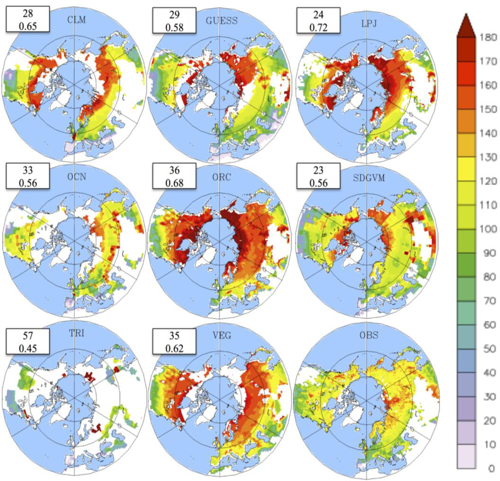 Mean growing season length (1986–2005) in days for 8 LSMs and satellite observations over the Northern Hemisphere (30°–90°N). Spatial correlations and root mean square errors between each model and the observations are given in the white boxes.
