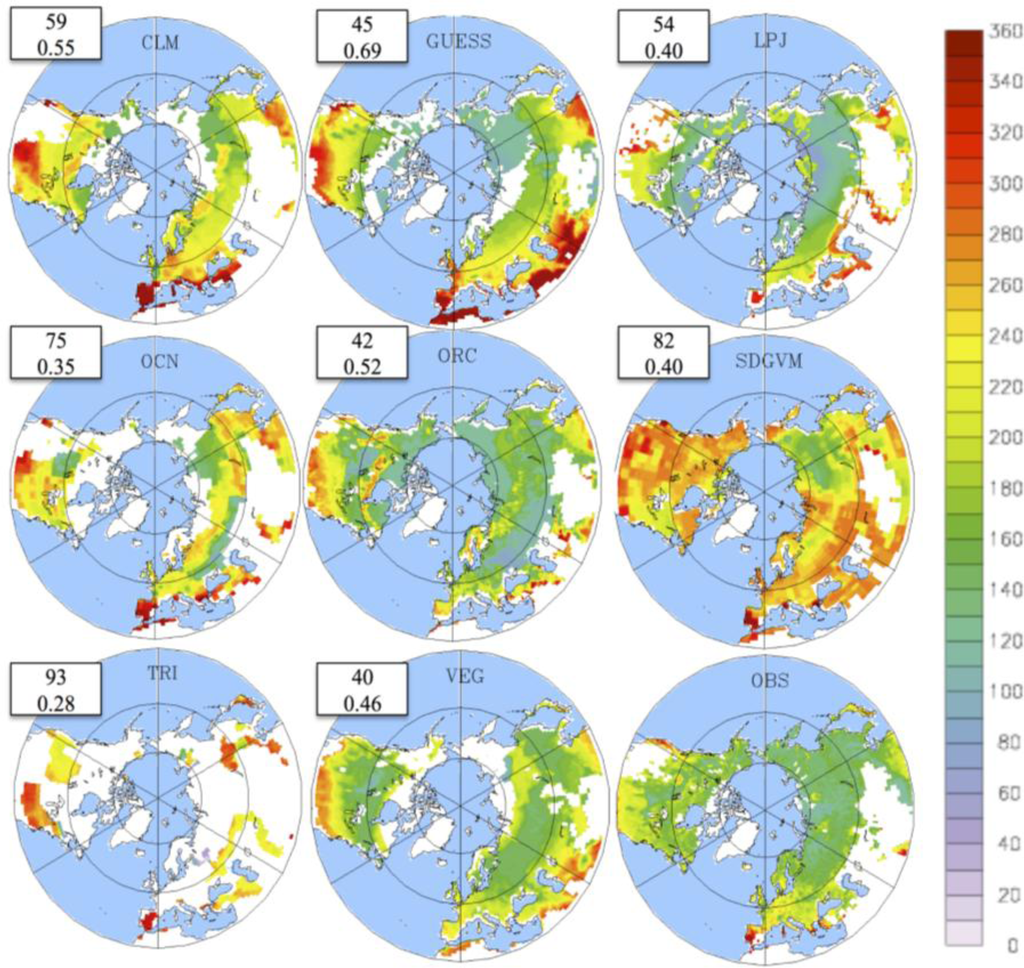 When looking at the hemispheric mean values it is clear that all of the models overestimate the LAI, dormancy and length of the growing season (Table 2). Satellite LAI average for the Northern Hemisphere was 0.83, while LAI from the models varies between 0.98–2.16. Both growing season onset and dormancy were later in all of the models, in some cases by more than a month. The effect of the late offset translates as an increased GSL, with values 9 to 180 days higher than the satellite data (Table 2). However, when the dormancy period is calculated based on GPP the modeled values become much closer to the observations, with an average GSL of 144 ± 15 days, compared to 184 days in the satellite data. This again suggests a decoupling between the active period of photosynthesis and leaves in the models.
