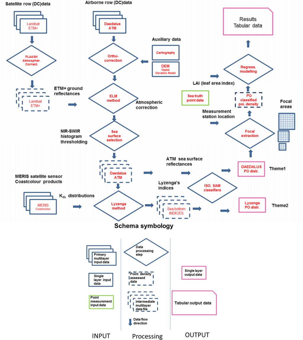 Aiming at implementing an improved method able to find out more about the distribution of PO in more threatened areas and turbid waters and detect its spatial patterns mainly linked to local impact intensity and processes at various scales and according to previous works [14,15], we proposed an integrated approach based on airborne remote sensing HR observations, their suitable operative atmospheric and water colum radiometric preprocessing then in situ validation and test. The 12 band visible (Red, Green, Blue), NIR-SWIR (Near Infrared, middle Short Wave Infra Red) and TIR (Thermal Infrared) data acquired by Daedalus 1268E sensor, were used here for methodology implementation and to derive the required thematic products while compatible Landsat ETM+ multispectral data and MERIS Coastcolour [16] products were exploited in the necessary radiometric preprocessing step to account for the atmospheric and water column noise contributions. In particular, as indicated in the following schema (Figure 1) ground reflectances retrieved from a 7 bands, Landsat ETM+ (Enhanced Thematic Mapper+) frame using a FLAASH code and ELM (Empirical Line Method) method were the main components of the atmospheric correction procedure, while the water column transparency correction was mainly based on MERIS (MEdium REsolution Imaging Spectrometer) sensor Coastcolour data products, devoted to coastal monitoring applications, and Lyzenga method. Accordig to the attached symbology legend the Figure 1 schema describes the implemented methodology in terms of multilayer (mainly remotely sensed), single layer and point data inputs, processing steps (including methods citations referenced in the next chapters), and the main outputs, in particular the two single layer thematic maps (Theme1, Theme2) derived from classification. The auxiliary data encompassing the DEM (Digital Elevation Model) and cartographic maps at suitable scale have been used mainly for geometric correction and georefencing purpose. In particular the Landsat ETM+ and Daedalus ATM raw data were preliminarly orthorectified and reprojected to the same UTM zone 33N (WGS84) cartographic coordinates system compatible with that of the other used layers. The sea surface selection step reported here consisted in the subset from the entire atmospherically corrected Daedalus ATM strip of the portion related to the sea surface using the histogram thresholding of the NIR-SWIR bands, characterized by low values of water reflectances. This water surface selection step was introduced to improve the subsequent classification procedures. The Coastcolour products have been specifically designed and tested taking into account the specific monitoring needs of coastal marine applications dealing mainly with case 2 waters and turbidities arising from consistent concentrations of optically active components.