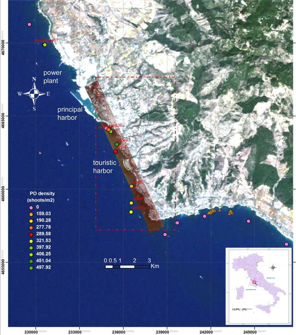 Posidonia oceanica (L) Delile (PO) is one of the most important Mediterranean seagrass and is distributed along many Italian coasts which currently host more than 40% of European PO meadows. While PO ecosystems guarantee stability of the littoral zones affected by erosion and play a fundamental ecological role by providing indispensables oxygen and biomass from their photosynthetic activity to other sea organisms, here they are threatened and under stress from many factors and generally exibit a meadows surface and productivity reduction [1]. Both the direct disturbances arising from marine activities (harborages, dredging and escavation works, …) and the shallow waters turbidity coming from increased human factors (urban settlement concentration, agriculture, land use, …) focusing on the coastal areas and the consequent rise of sediment and pollution discharged by the rivers are within the main reasons for Mediterranean and Italian PO decline [2]. In perspective these effects may be further strengthened by rain intensity, sea temperature and acidification rise expected by ongoing global climate changes.