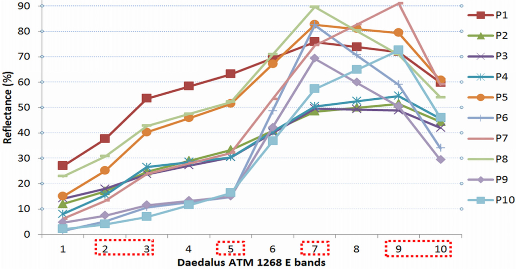 Point target (P1–P10) ground spectral signatures applied with ELM method. The dash-contoured x-labels indicate the ETM+ reflective bands correspondence.