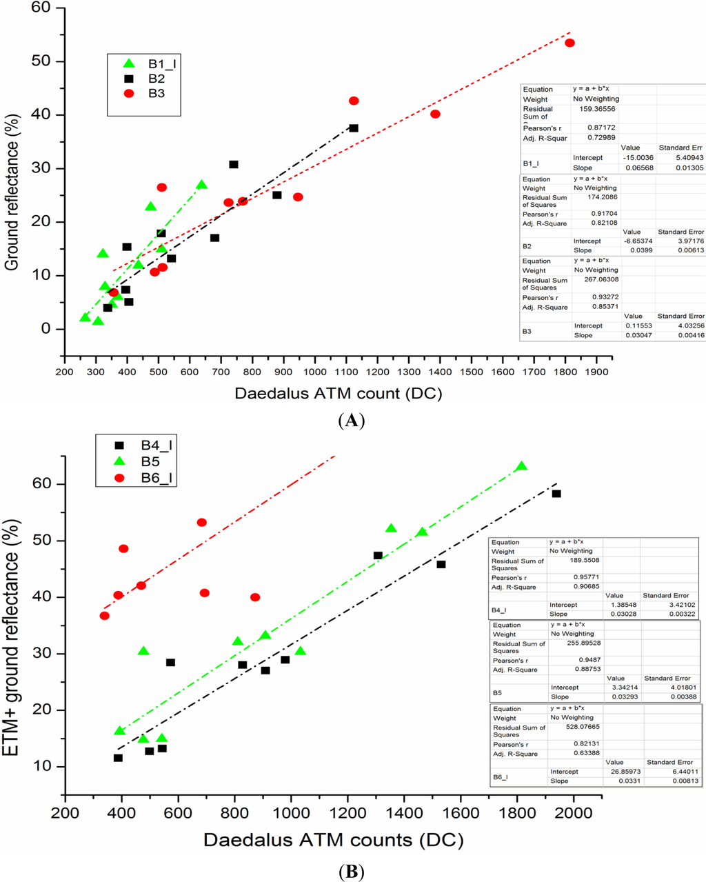 Regression models for Daedalus ATM reflectance ground retrieval through ELM method from ETM+ atmospherically corrected ground reflectance data for bands 1–3 (A) and bands 4–6 (B). Here BX state for the related Daedalus spectral band while the I suffix means interpolated data.