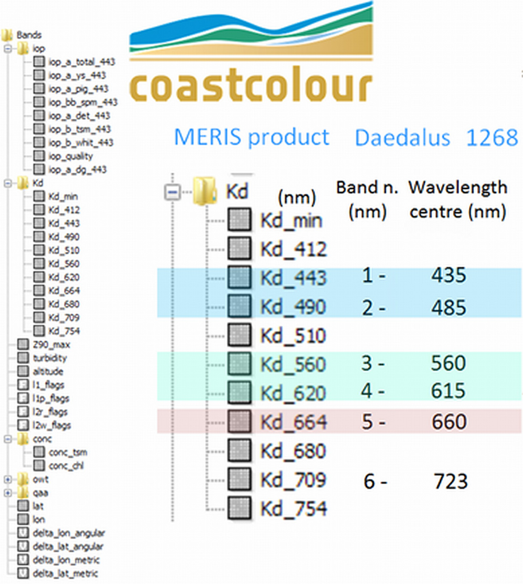 Coastcolour MERIS thematic products included the Kdi coefficients corresponding to Daedalus ATM 1268E bands (within the colored strips).