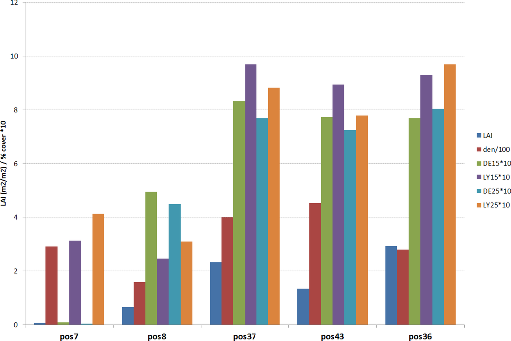 LAI and PO density (shoots/m2) rescaled point measurements and corresponding corver focal densities derived from classification of Daedalus ATM reflectances (DExx) and Lyzenga indices (LYxx).