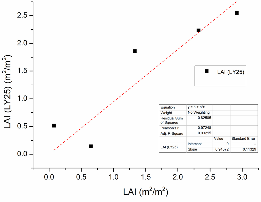 Measured (x-axis) vs. modeled (y-axis) LAI using the LY25 model coefficients.