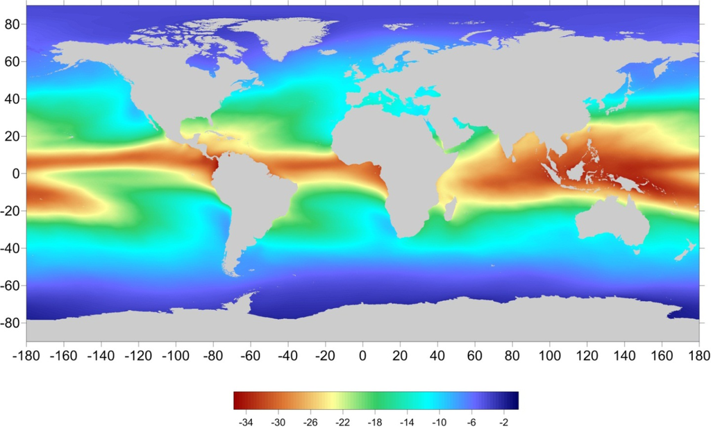 Mean values of WTC show a near-zonal dependency, with absolute values ranging from less than 5 cm at high latitudes to ∼35 cm near the equator and the tropics (Figure 1). The standard deviation ranges from 1–5 cm near the poles to 10–15 cm in the tropics (Figure 2).