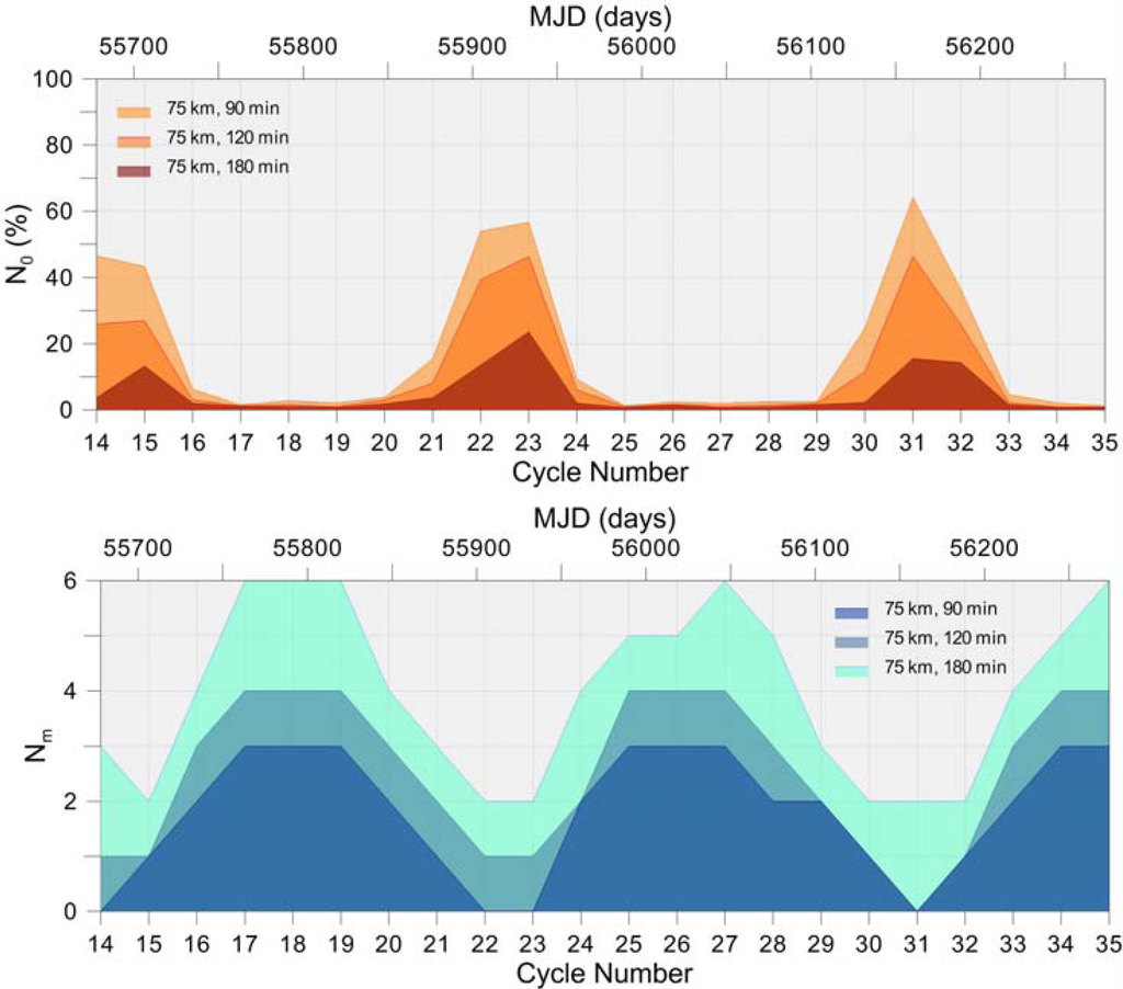 Having analyzed two sub-cycles representative of the most and less favorable conditions and knowing that the coverage is function of latitude, the percentage of CS-2 points with zero SI-MWR images available (N0) and the mean number of images available within a certain region (Nm) was computed for two latitude bands: ±5° and in 40°–50°, using ΔD = 75 km and three values for ΔT (90 min, 120 min, and 180 min). Results are illustrated in Figures 10 and 11 respectively.