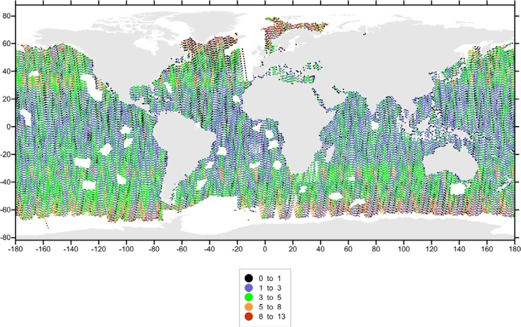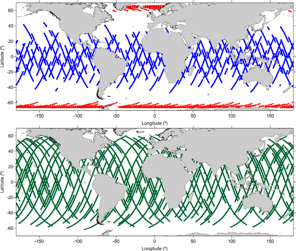 Considering that the inclination of each sun-synchronous satellite is greater than 90° and that of J2 is less than 90° (66.4°), the number of J2/SSat collocated points is maximum when an ascending SSat pass is in phase with a descending J2 pass and vice versa, which happens once every 118 days (∼12 J2 cycles). For example, considering Coriolis, this happens for J2 cycles 108, 120, and 132 represented in Figure 12.