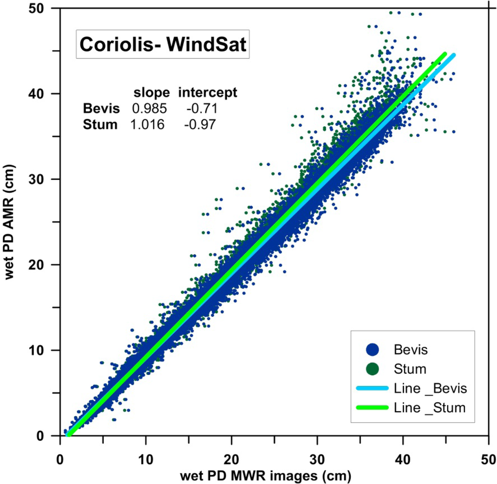 Wet path delay from AMR vs. the corresponding values from Coriolis/WindSat using the Bevis (blue) and the Stum (green) approaches. The solid lines represent the linear fit to each dataset.