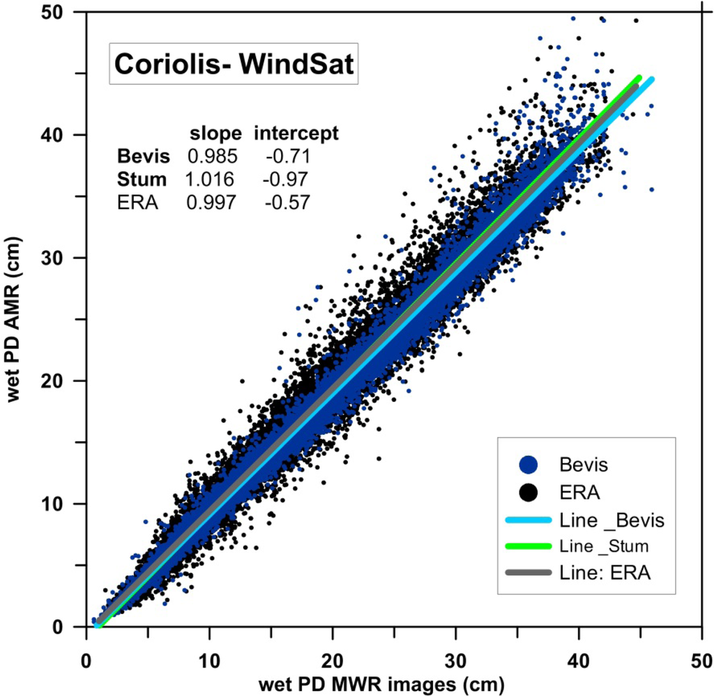 Wet path delay from AMR vs. the corresponding values from Coriolis/WindSat using the Bevis approach (blue). In black the corresponding values from ERA Interim. The solid lines represent the linear fit to each dataset.