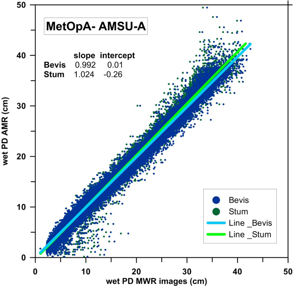Wet path delay from AMR vs. the corresponding values from MetOp-A/AMSU—A using the Bevis (blue) and the Stum (green) approaches. The solid lines represent the linear fit to each dataset.