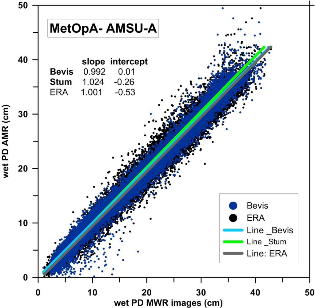 Wet path delay from AMR vs. the corresponding values from MetOp-A/AMSU—A using the Bevis approach (blue). In black the corresponding values from ERA Interim. The solid lines represent the linear fit to each dataset.