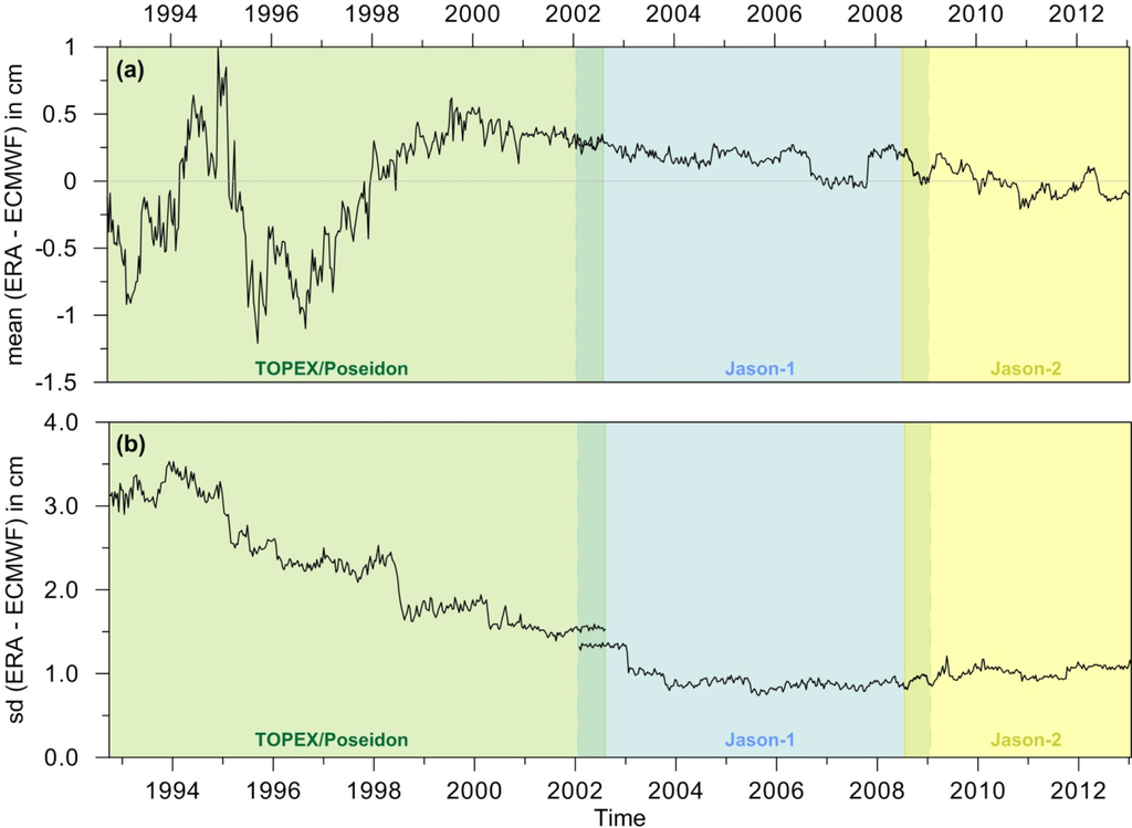 (a) Mean and (b) standard deviation (sd) of the differences between the WTC computed from ERA Interim and the ECMWF operational model (in cm) for each cycle of the three reference altimetric missions: T/P, J1 and J2.