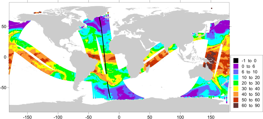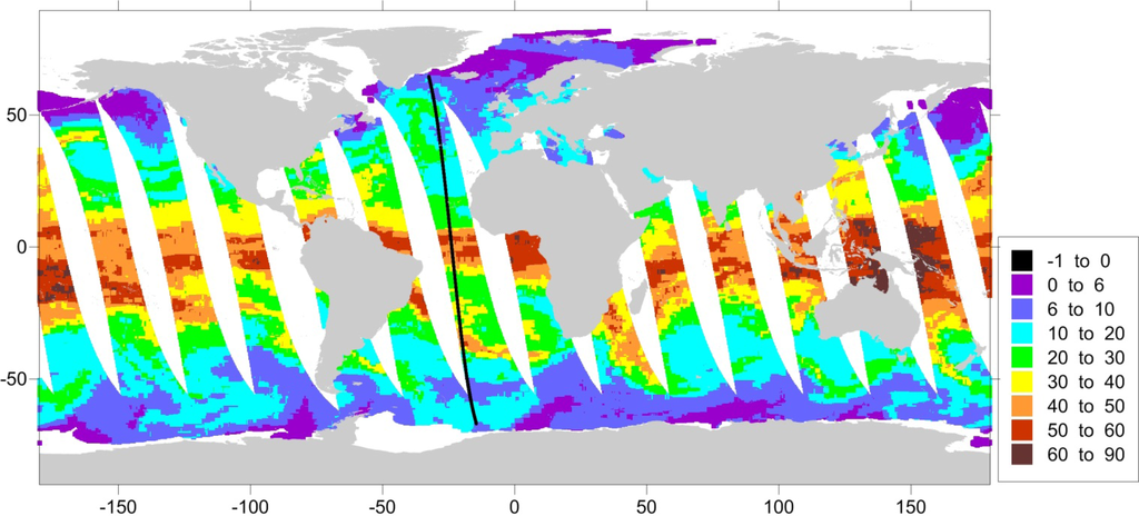 Concerning TRMM, since its orbit is not sun-synchronous and with an inclination of 35°, each CS-2 pass will always cross a TRMM pass within two hours, in the latitude band ±40° (Figure 3). Therefore, in this latitude band, a portion of each CS-2 pass will always have TMI images available.