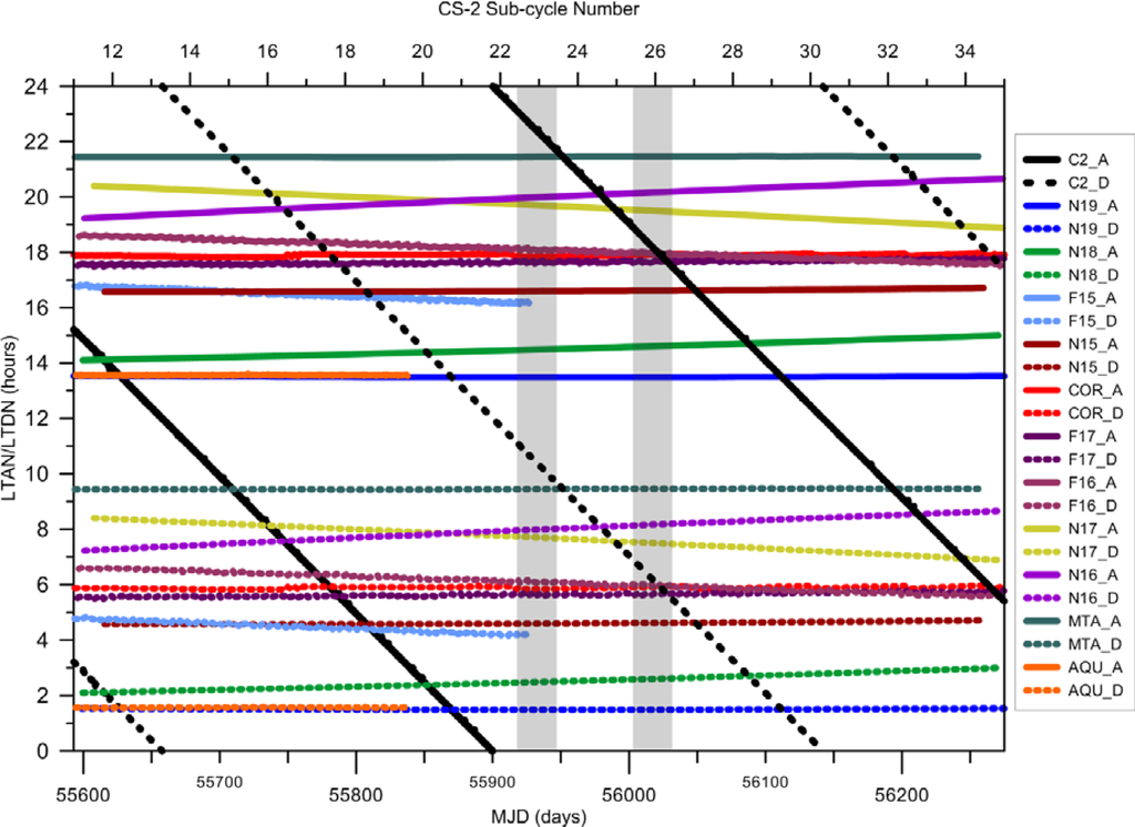The variation of CS-2 orbit with respect to each sun-synchronous satellite can also be inspected in Figure 7, which represents the time evolution of the LTAN and local time of descending node (LTDN) of all 11 sun-synchronous RS satellites and of CS-2 passes from the middle of sub-cycle 11 (February 2011) to the middle of sub-cycle 35 (December 2012).