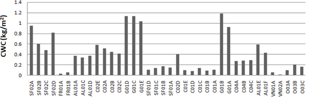 Note that the measured CWC refers to the total mass of liquid water content in foliage and stems per ground area (kg/m2) since both Cw and LAI measurements account for all the vegetation elements. In situ CWC values at Barrax area (Figure 2) range from 0.05 kg/m2 for vineyards and fruit trees to 1.2 kg/m2 for garlic crops.
