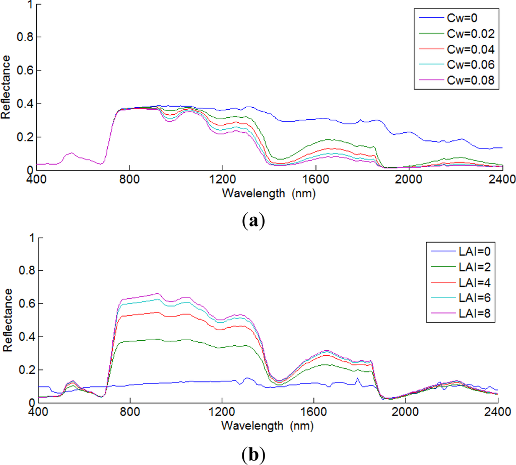Spectral sensitivity analysis of the canopy reflectance to (a) Cw (g/cm2) and (b) leaf area index (LAI) in the 400–2400 nm spectral domain. The values of other PROSAIL parameters were set to their mean values (Table 1).