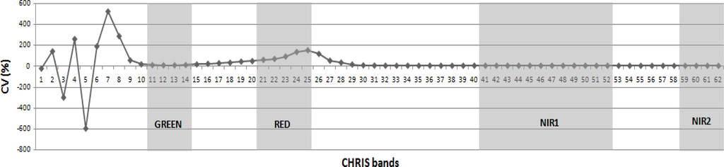 - A coefficient of variability (CV), defined here as the ratio between the standard deviation of reflectance measurements and their mean value expressed in percentage, was computed over a homogeneous surface as an indicator of the stability of reflectance measurements to signal noise. Results (Figure 4) show that first CHRIS bands located in the blue spectral domain are significantly affected by residual atmospheric effects (non-physical negative values of reflectances and high CVs). Residual noise also affects the CHRIS bands in the red domain.