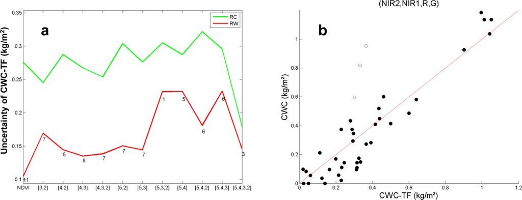 (a) Performances (Weighted RMSE (RW) and cross-validation RMSE (RC)) of empirical transfer functions for CWC estimation based on different band combinations (1: NDVI, 2: 551.9 nm, 3: 641.8 nm, 4: 869.1 nm, 5: 988.3 nm). The number of ESUs with associated weight lower than 0.7 is indicated for each band combination. (b) Comparison between in situ CWC measurements and the best transfer function (TF) estimates. Unfilled circles correspond to ESUs with associated weights lower than 0.7. The red line corresponds to the 1:1 line.