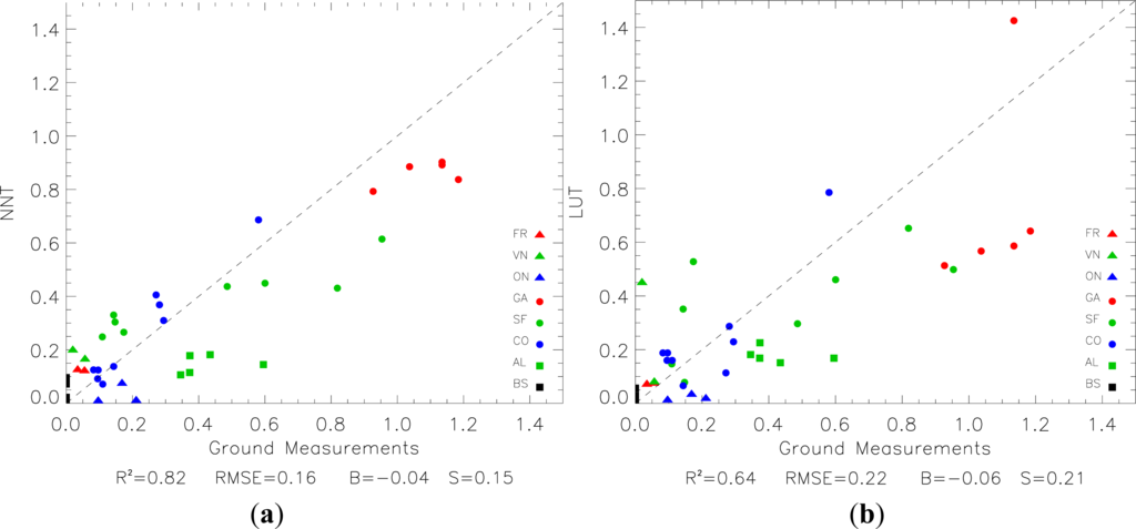 Comparison of (a) neural network (NNT) and (b) look up table (LUT) estimates with ground measurements of CWC (kg/m2). Symbols correspond to crop types: fruit trees (FR), vineyard (VN), onion (ON), garlic (GA), sun flower (SF), corn (CO), alfalfa (AL) and bare soil (BS). The statistics are: correlation coefficient (R2), root mean square error (RMSE), bias (B) and standard deviation (S). The dashed line corresponds to the 1:1 line.