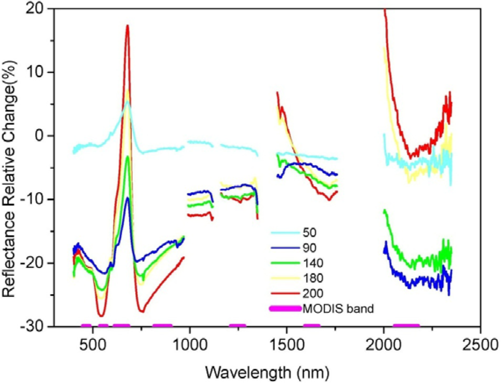 The percentage relative spectral reflectance changes, from the zero cone density case to the various cone density levels (Equation (6)), are shown in Figure 3. The most pronounced relative reflectance changes occurred in the visible spectral region and SWIR region beyond 2,000 nm (Figure 3). Visible reflectance changes were highly spectrally-dependent and most intense with the highest level of cones and varied from nearly −30%, in the Blue, Green, and NIR, to +17% in the Red region, relative to the juniper canopy without cones. The SWIR region beyond 2,000 nm resulted in nearly equivalent differences, ranging from −25% to +15%. The remaining spectral region, from ∼1,000 nm to 2,000 nm, varied the least with relative changes between −10% and +5%. Only small portions of the SWIR region, at 1,450–1,540 nm, 2,000–2,100 nm, and 2,270–2,350 nm, showed positive reflectance changes, which occurred only for the higher juniper cone densities (Figure 3).