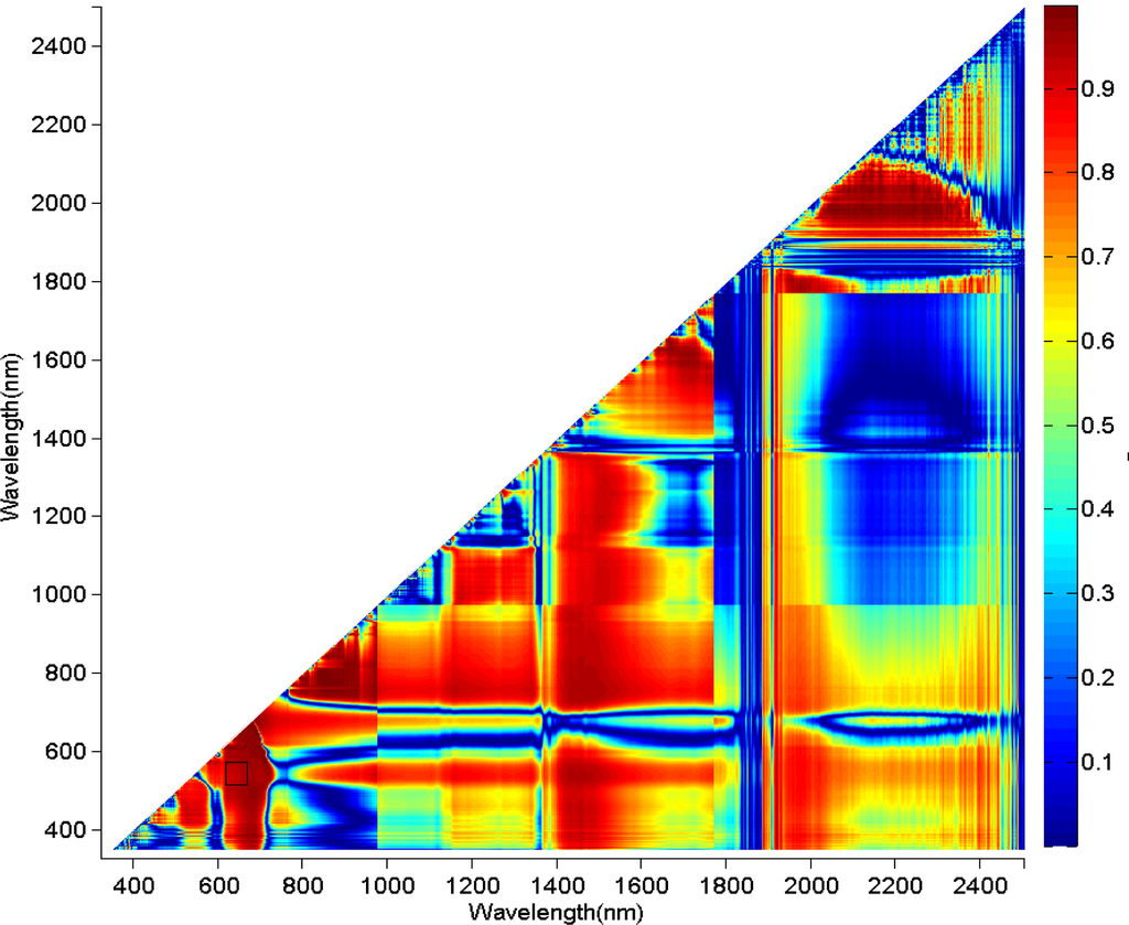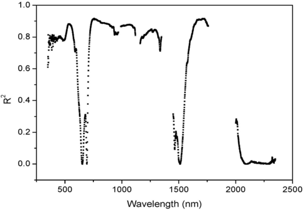 The coefficient of determination (R2), slope (S), and coefficient of variation (CV) were used to select the most sensitive bands (or VIs) to changes in juniper cone density. R2, S, and CV are defined as follows: R2 is the square of the correlation coefficient between reflectance (or VIs) and the cone densities. S, or named gradient, was calculated by the change in the reflectance (or VIs) divided by the corresponding change in the cone densities, where the relationship between measured reflectances (or VIs) and the cone densities was linear, and no transformation for S calculation was required. Higher values of R2 and S indicate a more significant change of reflectance (or VIs) with cone densities. CV was defined as the ratio of the standard deviation of reflectance (or VIs) to their mean value, which showed the extent of variability in relation to mean of the reflectance (or VIs) caused by juniper cone changes. We calculated R2, S and CV using the MATLAB software.