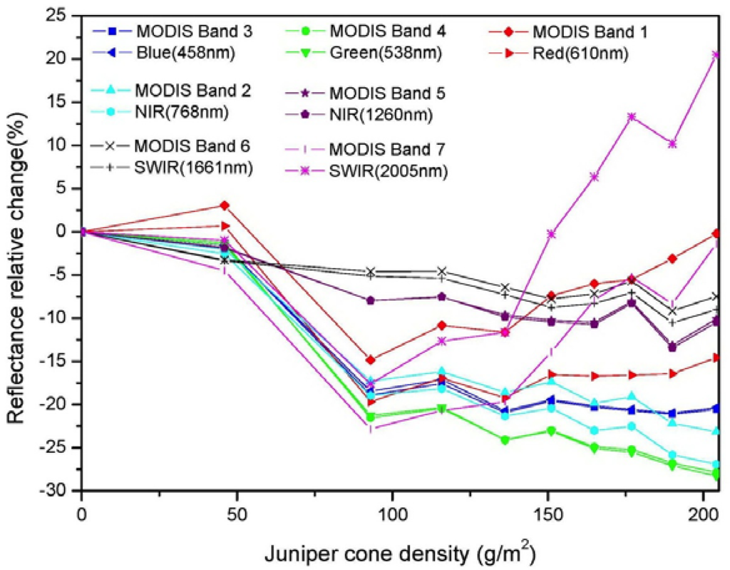 In this study, in-situ juniper canopy reflectance spectra with 10 cone density levels were measured with a field-based ASD spectroradiometer over black, loam, and sandy soils. The reflectance values of the juniper canopy generally decreased at spectrally variable extents with the presence of juniper cones, especially in the Blue, Green, and Near Infrared (NIR) bands, while the Red and portions of the Shortwave Infrared (SWIR) showed mixed responses. The decreases of the reflectances in MODIS Blue, Green, NIR, SWIR bands (Bands 3–6) and corresponding narrowbands (458 nm, 538 nm, 1,260 nm, and 1,661 nm) were similar, although the narrowband versions were slightly more sensitive. However, the Red, NIR, and SWIR narrowband reflectances of 610 nm, 768 nm, and 2,005 nm were more sensitive to cone density variations than equivalent MODIS Bands 1, 2, and 7, respectively. The largest decrease in reflectances was observed over the lower cone density levels, between 50 and 90 g/m2, in all bands except for MODIS Band 5 (1,230–1,250 nm) and Band 6 (1,628–1,652 nm). The reflectances in MODIS Band 1 (620–670 nm) and Band 7 (2,105–2,155 nm) at the highest cone density level (200 g/m2) showed nearly identical reflectances with the 0 g/m2 cone juniper measurement, While for their corresponding narrow bands of 610 nm and 2,005 nm, where reflectances decreased ∼15% and increased ∼20%, respectively.