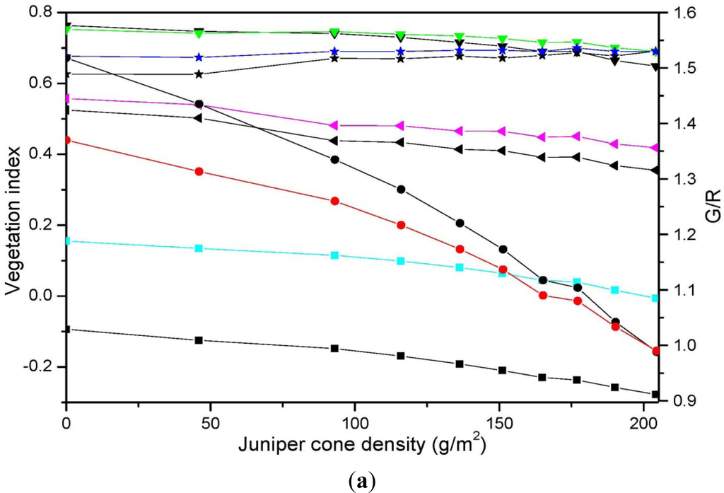 The percent VI relative changes induced by juniper cones are depicted in Figure 8b. TBVI (502 nm, 670 nm), narrowband GNDVI (538 nm, 1,215 nm) and broadband MODIS GNDVI increased strongly, with the narrowband TBVI showing the largest variation of ∼200%. The TBVI calculated from MODIS Bands 4 and 1 decreased ∼100% with cone density. The other indices decreased as a result of juniper cone presence. The NDVI and GNDVI derived from MODIS broadbands showed less sensitivity to juniper cones decreasing by 8% and increasing by 2%, respectively. Narrowband EVI and G/R decreased by ∼30% as a result of cone presence on the juniper canopy. The reflectance in the Green band decreased with higher cone densities, resulting in increasing GNDVI values. Based on the CV in Table 2 and the relative change in Figure 8b, all VIs derived from narrowbands had larger variation than those derived from MODIS broadbands, which can also be found in Figure 8b.