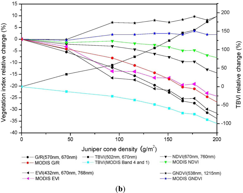 (a) Vegetation index and (b) Vegetation Index relative changeover different juniper cone densities, including MODIS broadband and narrow bands with the best-fit R2 values in Table 2.