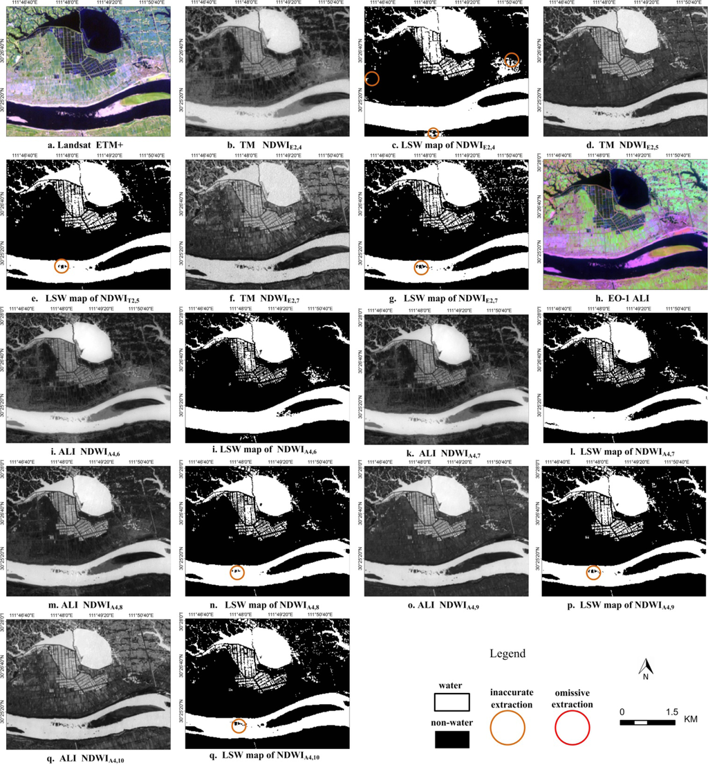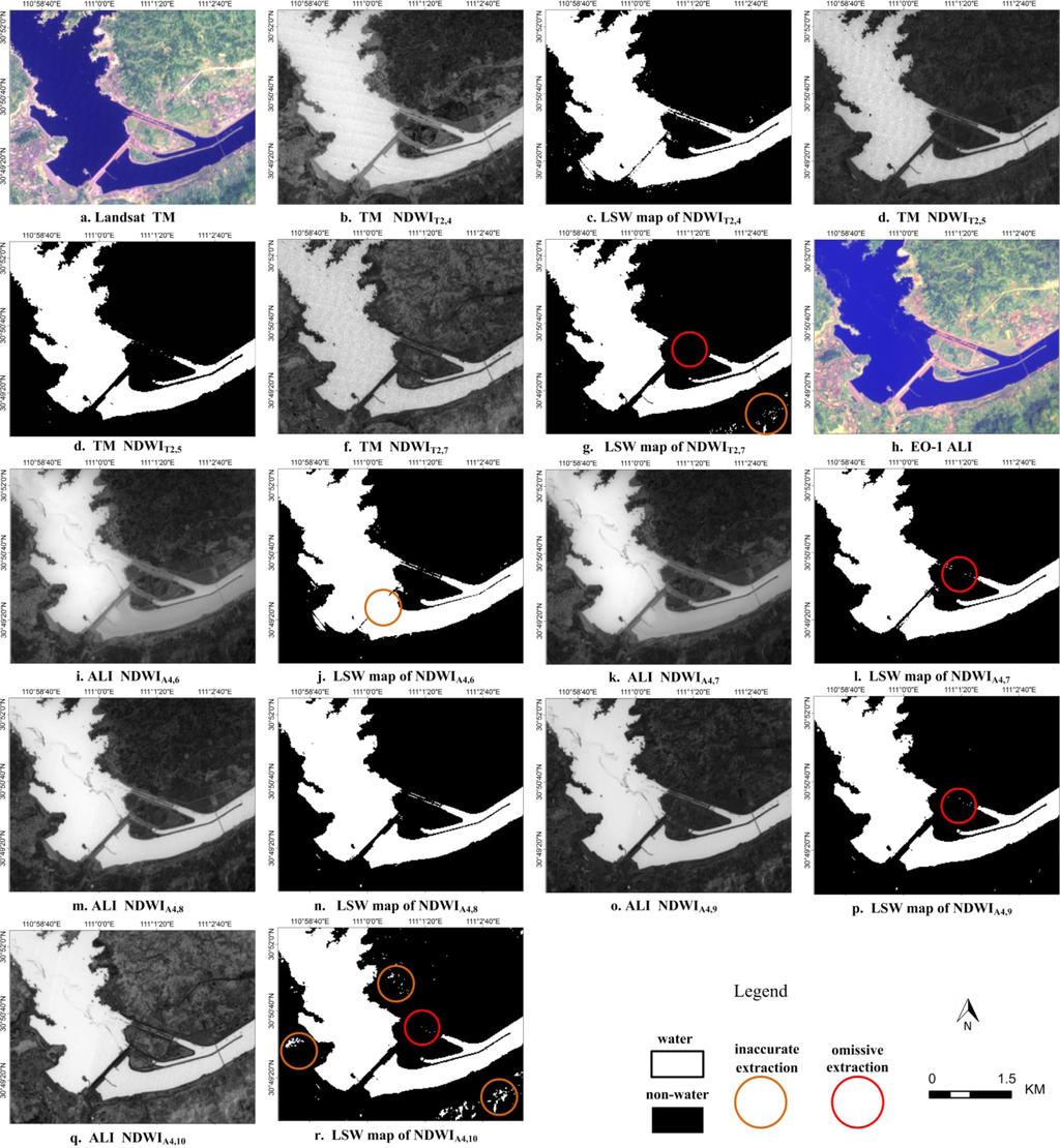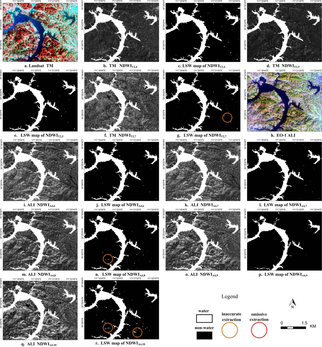 Based on the above analyses, we conclude that the normalized difference water index based on the green band (i.e., Band 4 of ALI or Band 2 of TM) and the SWIR band (i.e., Band 9 of ALI or Band 5 of TM) with the spectrum region of 1.550–1.750 μm, that is, Xu’s NDWI or MNDWI, is the optimal choice for water body information enhancement and LSW mapping.