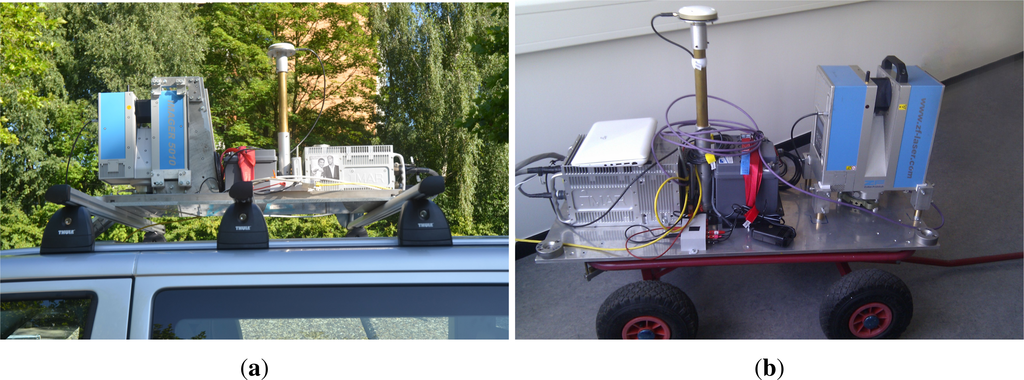 In recent years, mobile mapping systems have become a field of research in geodesy. The mobile LiDARsurvey system makes it possible to acquire time-saving and fully-equipped environment data using laser scanners from moving platforms (car, plane, ship). All available mobile mapping systems consist of multiple sensors and can be classified according to two functions: the acquisition of environment data and of trajectories. For the acquisition of the environment, preferably one or more laser scanners are used. These scanners are mounted either perpendicular to the main direction of movement or slightly tilted with two scanners. This latter version is called a butterfly arrangement, because of the orientation of the profile planes. For trajectory acquisition, a system can be equipped with three sensors. A GNSSantenna is deployed to provide the absolute position over time. The inertial sensors measure the spatial position and the highly dynamic motion of the system at a very high data rate. The third widely-used sensor is the odometer. An odometer allows precise determination of the traveled distance. Together with the inertial sensor, the odometer is used to compensate for short-term GNSS measurement gaps. Recent studies on MLSsystems and their accuracy can be found in El-Sheimy [1], Kaartinen et al. [2], Brenner [3], Haala et al. [4], Hassan and El-Sheimy [5] or Puente et al. [6] An almost complete overview of the state-of-the-art of mobile mapping systems can be found in Petrie [7] or Graham [8]. Research and development on multisensor mobile mapping systems has been performed since the early 1990s. The development of this system has greatly accelerated in recent years, in part because of technologies, such as Google and its Street View program. One of the latest application trends is to deploy such systems in indoor environments.
