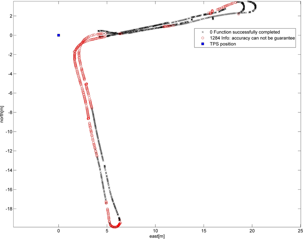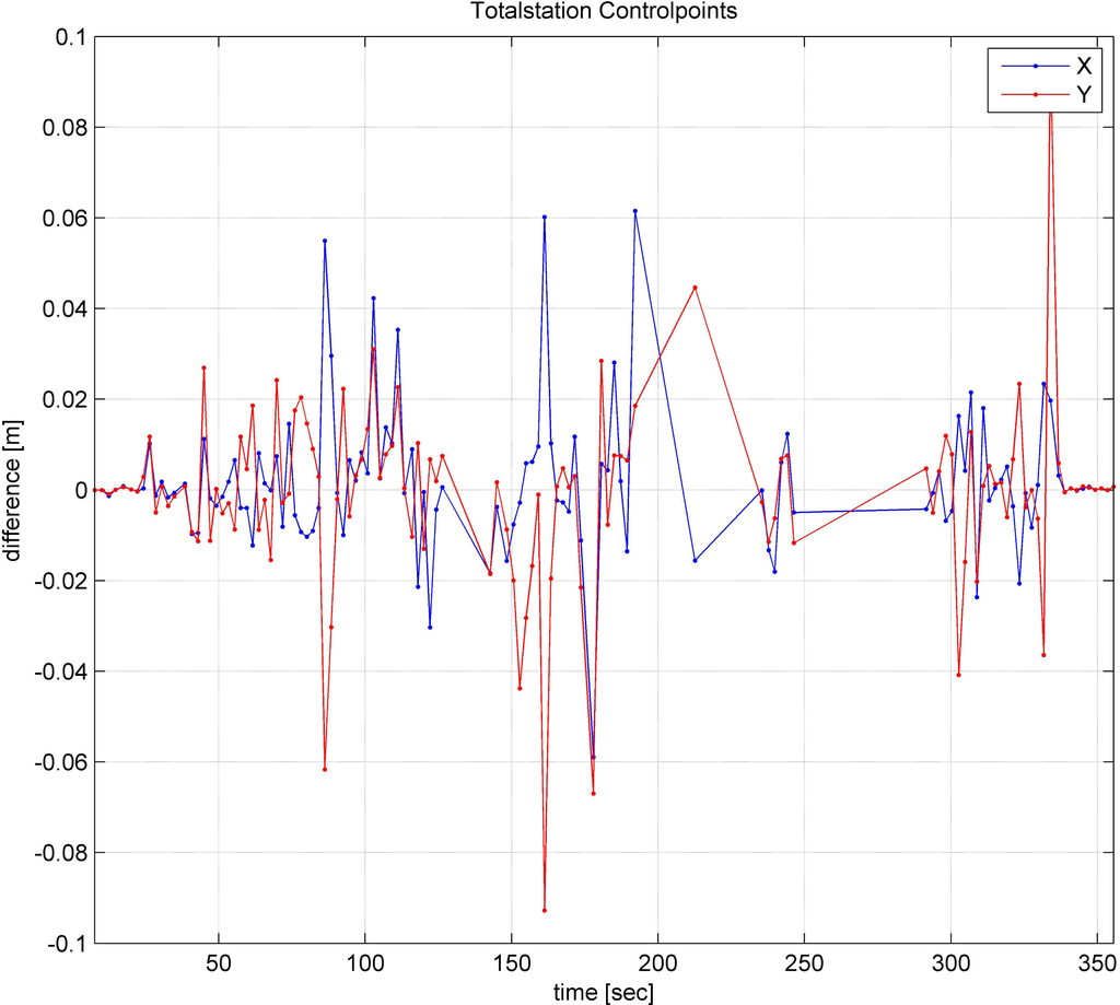 The moving direction of the platform during the test was mainly in the X-direction (east). After it crossed the starting point, the platform moved in the Y-direction (north). A strong correlation between the direction of motion and the magnitude of the coordinate differences could be observed. The coordinate differences are clearly significant along the track direction of the trajectory, but are reasonably small along the cross-track direction. The cause of this phenomenon is still under investigation. On the one hand, this may have resulted from an incorrect time apportionment, because the time could have a much greater impact on the trajectory estimation along the track direction than along the cross-track direction. On the other hand, the distance measurements from the total station can be problematic. This problem also affects the along-track direction, due to the location used. The deviations shown in Table 3 are slightly higher than those in Case 3, when all measurements were considered. However, with the GeoCom interface, a significantly high data rate could be produced. In Case 3, the measuring frequency was 1 Hz, as the data rate in Case 4 was, on average, 8 Hz. At a higher data rate, the plausibility of the measurements can be checked. Movements of more than 10 cm within 100 ms are unlikely to result in a maximum speed of