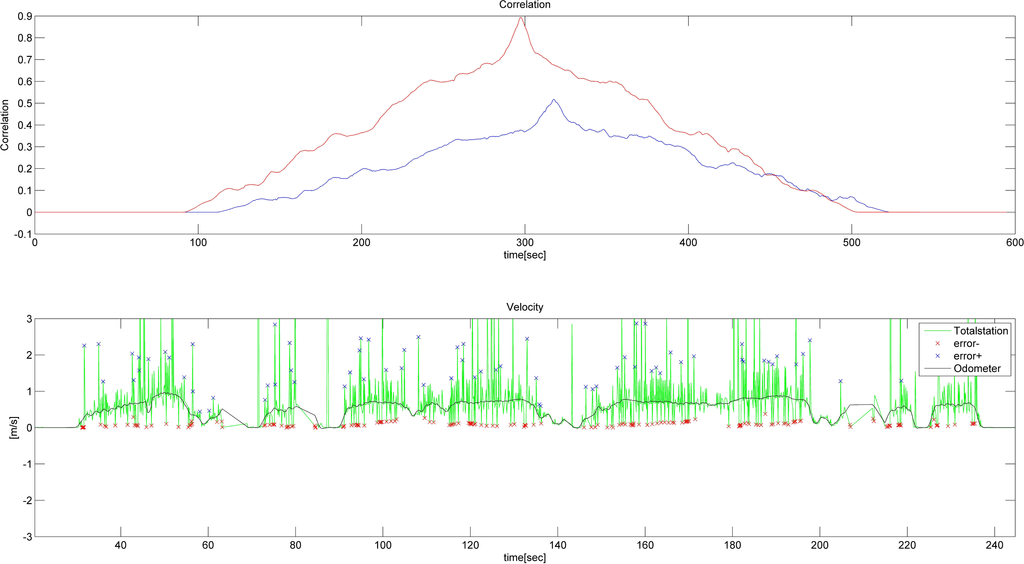 It seems that the trajectory conforms well to the measurements from the IMU and odometer. However, if the solution is reviewed again in more detail, the time offset can clearly be determined through the correlation calculation (Figure 11). The calculated velocities from the total station data were subject to large scatter. Consequently, the velocity profiles of the total station and odometer do not match.
