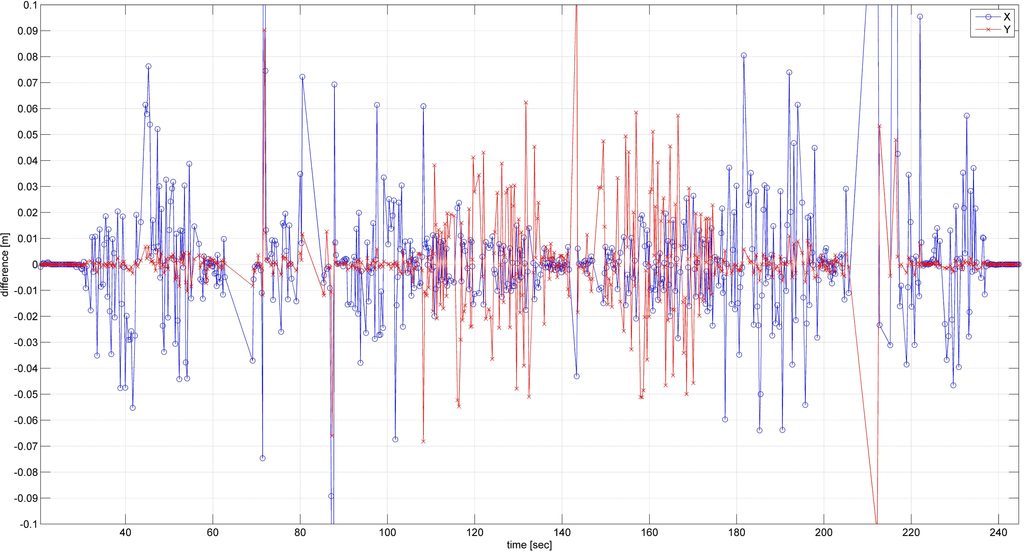 Then, the trajectory was estimated with these data by using Kalman filtering. Only every second point determined by the total station was used for control purposes. Figure 12 and Table 3 show the coordinate differences between the filter solution and the control points. In Figure 12, one can clearly observe certain abnormal behaviors other than the white noise, which has to be discussed.