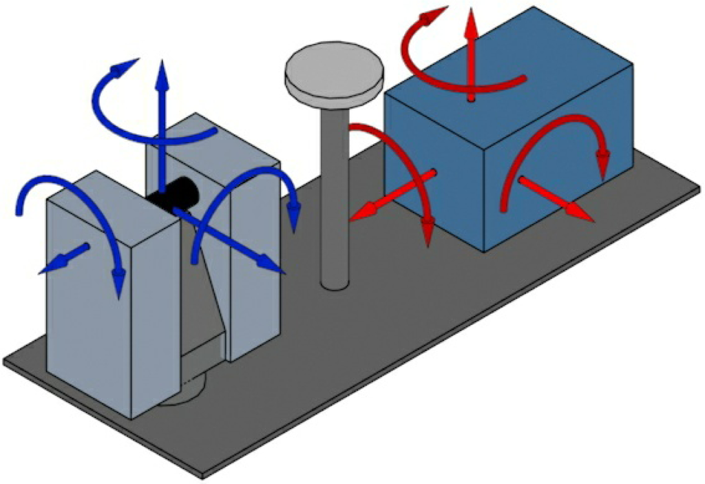 This relation can also be described by Equations (1) and (2). This results in an error for Sand C, respectively, which can be ignored. The second example illustrates the error effect of the boresight angles. It is assumed that the scanner has a measurement deviation of 4 mm at a distance of 50 m. This results in an angular error of 0.005°. As clarified in Section 3.1, this is the expected accuracy for the calibration. To determine the installation angles on the platform, only the body of the scanner can be used. The outside dimensions of the Zoller+ Fröhlich laser scanner are approximately 286 mm. An angle change of 0.005° on a short basis can cause a deviation of 24 μm. This deviation is difficult to determine, even using a laser tracker. Furthermore, it should be noted that only the position of the laser scanner’s housing on the platform can be determined, not the required orientation of the mirror in the laser scanner body. The external determination for the lever arm, therefore, should be considered. Determination of the angles, however, can be difficult using this method.